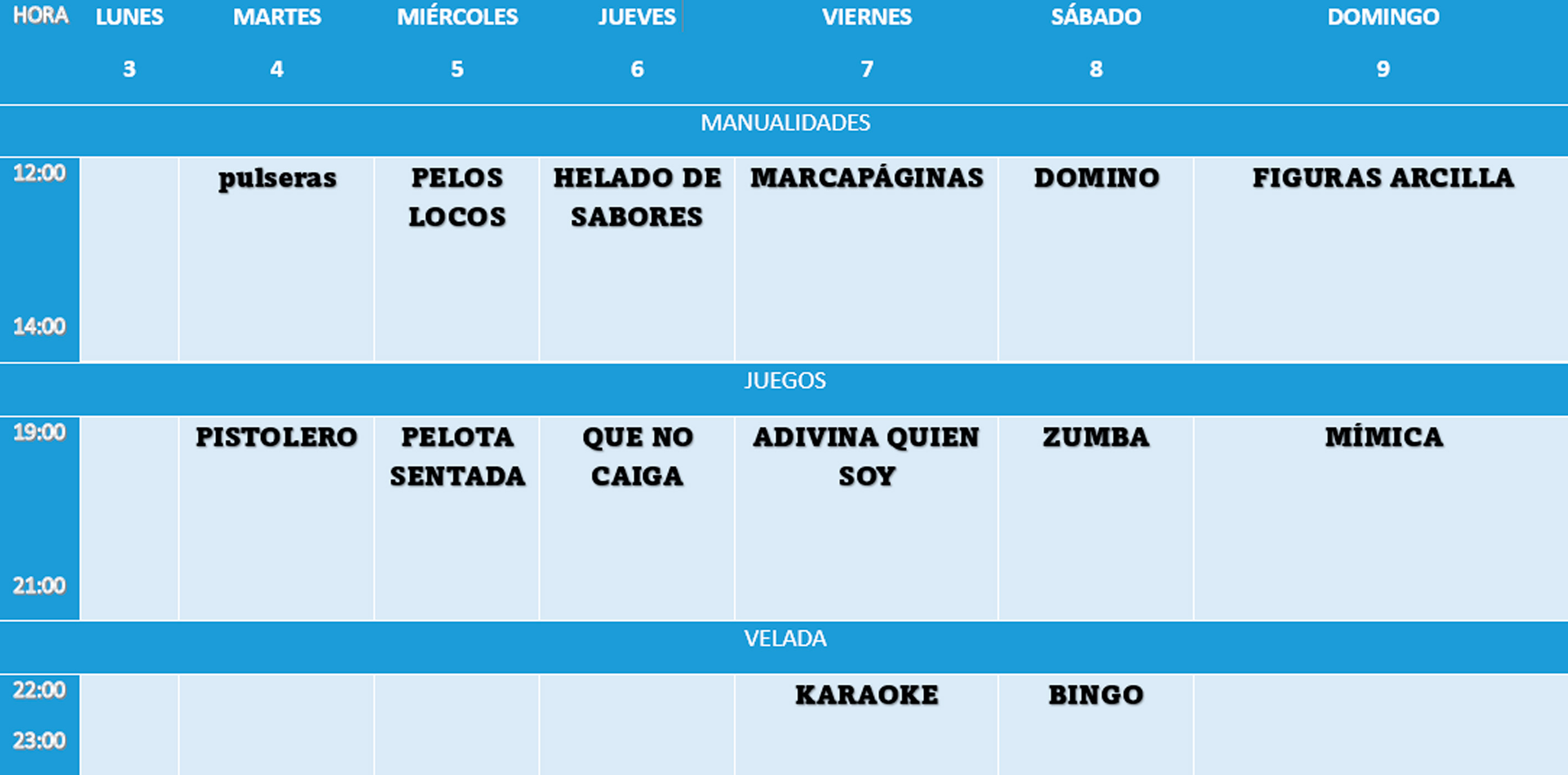 Talleres infantiles, pruebas deportivas, campeonatos de distintos tipos, juegos de mesa…