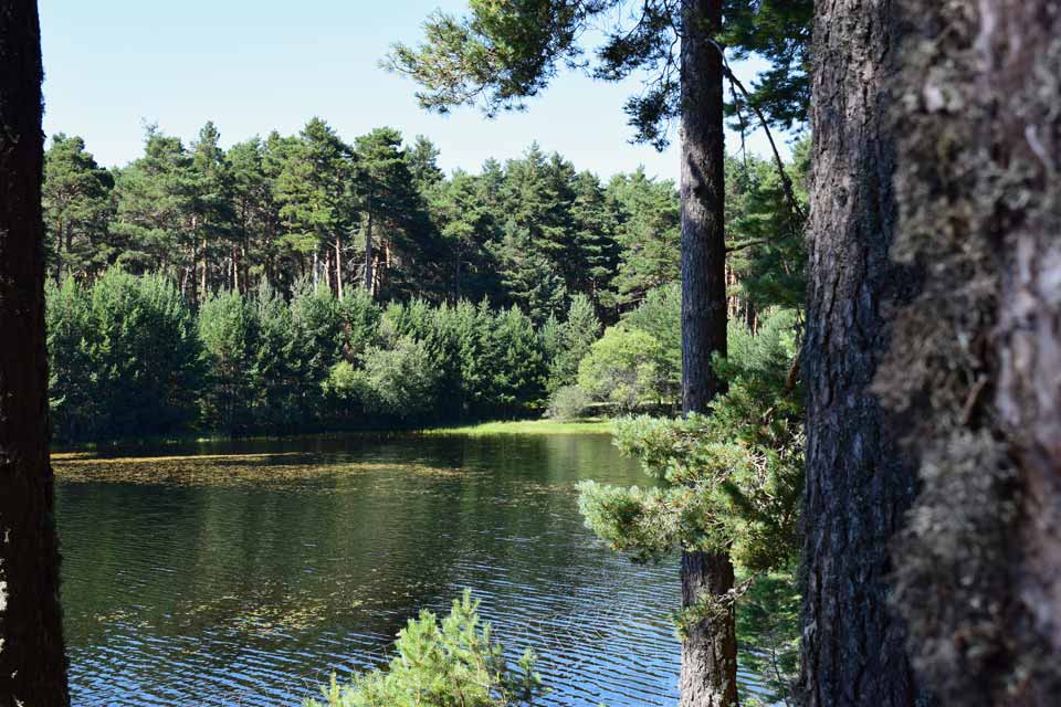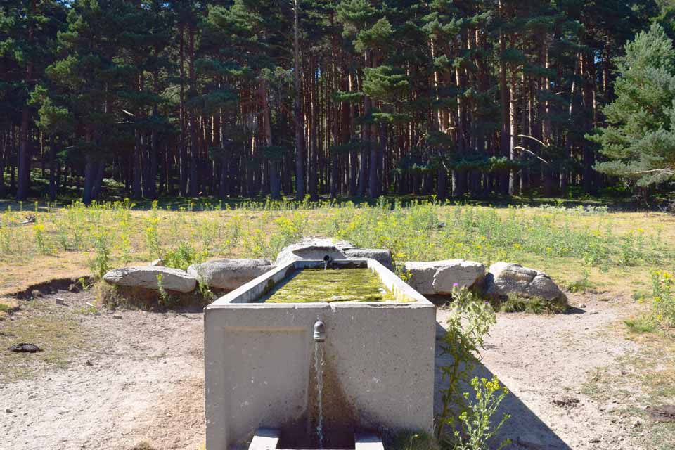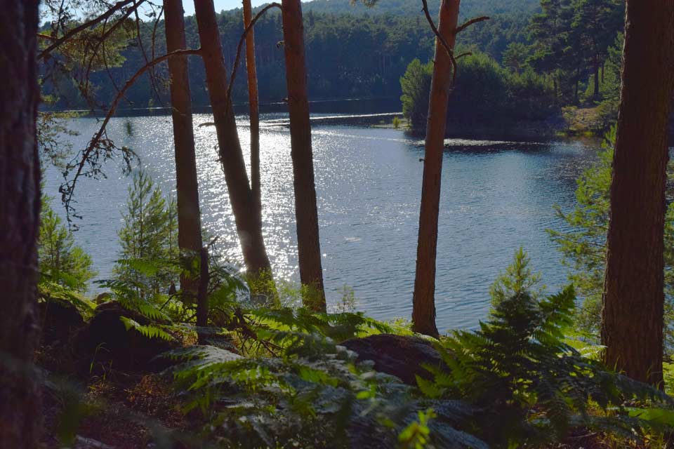Por espacio de 1’5 kilómetros y dejando siempre el arroyo a nuestra izquierda, llegaremos a la presa de Peguerinos, prácticamente desde donde se aborda realmente el recorrido. Aquí los pinos se bañan en el agua.