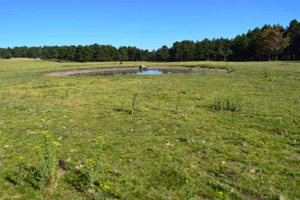 El recorrido es circular desde este momento y el objetivo es visitar unas lagunas que solamente los periodos estíbales calurosos pueden perder totalmente el agua, pero la idea es disfrutar de los bosques y las praderas. Recomendable llevar la merienda para disfrutar de un día de campo. El regreso desde la presa es el mismo, pero en sentido contrario.